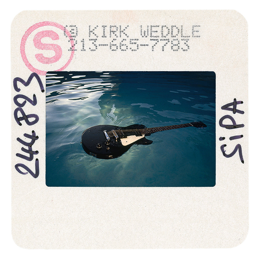 Signed print taken from an original colour slide of Kurt's floating guitar, Nirvana by Kirk Weddle. This slide was taken during the famous swimming pool sessions with Nirvana for the release of Nevermind in 1991, and photographed by Kirk to produce this series of prints.