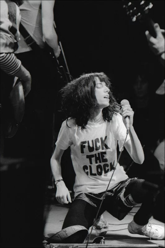 Patti Smith wearing her “Fuck The Clock” t-shirt by Allan Tannenbaum, taken at CBGB in New York, New Years Eve 1977