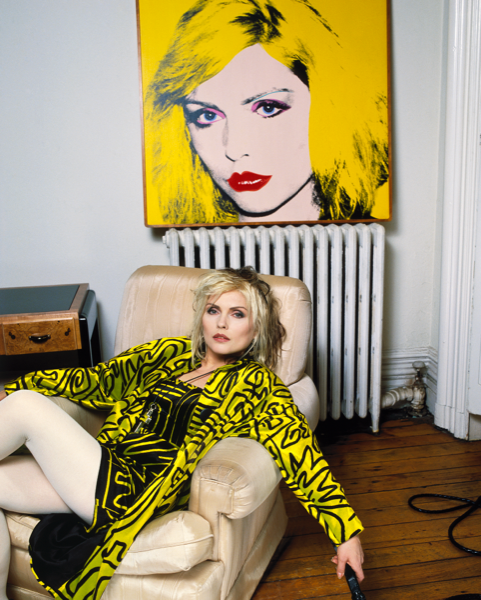 Debbie Harry, Blondie, with Andy Warhol's portrait in the background.