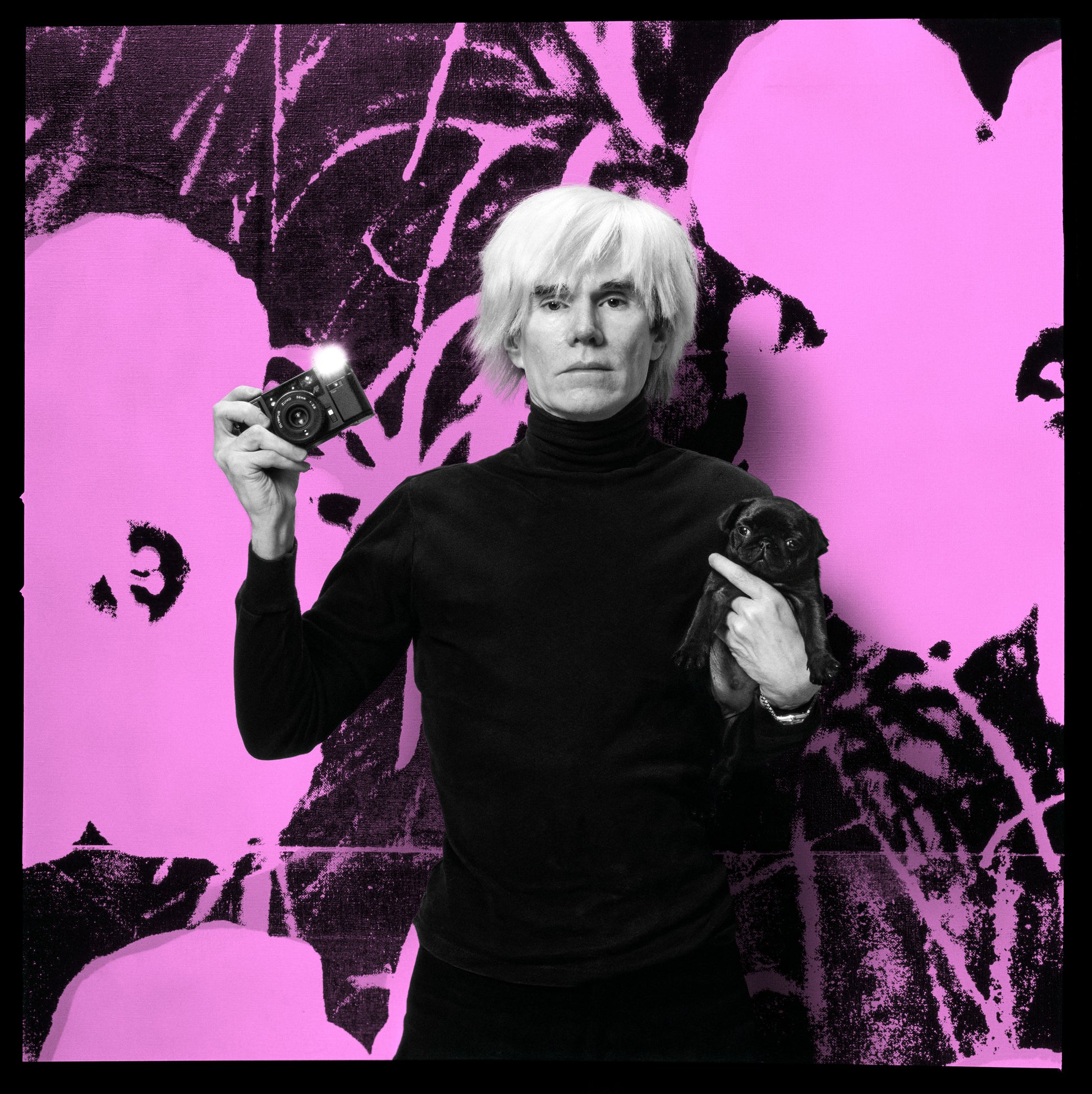 Andy Warhol photographed by Gary Heery with his Olympus AFL camera and Brigid Berlin's pug for American Photographer magazine, 1985.