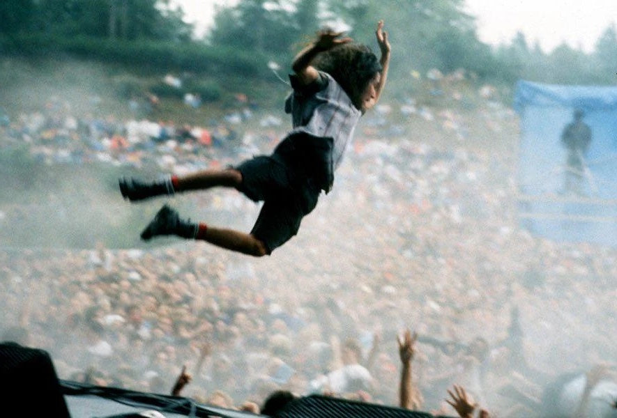 Eddie Vedder of Pearl Jam leaping from the stage at Lollapalooza in Vancouver, 1992.