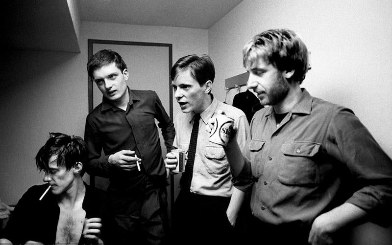 Jill Furmanovsky recalls, "Joy Division were playing at the YMCA in London supported by Monochrome Set. I don't remember which publications sent me to shoot the show but it was probably Sounds. The show was sold out and Ian Curtis was a compelling performer. I loved the strange way he moved in his grey school boy trousers. The band were not yet well known and it was easy for me to visit the dressing-room after the gig to take some pictures. They didn't mind and I didn't take too many to disturb them. I still think that pictures of the musicians just before or just after they've come off stage makes great rock photography."