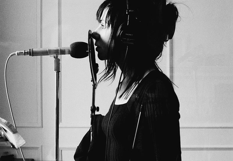"I was doing some documentary stuff in the studio during the recording of 'Stories From the City.......' Here I have my lens rested against the glass of the vocal booth - because there was glass between us I could photograph during vocal takes. I also experimented with using one film twice through the camera, so that accidents of layering occurred same subject (Polly in vocal booth) different sizes within the frame - We used some colour layered shots inside the album artwork." - Maria Mochnacz