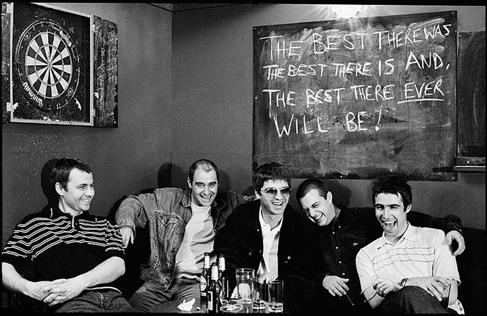 During a press shoot for the release of Be Here Now Tony Blair became Prime Minister of the UK, that added a certain celebratory atmosphere to the day. The words on the blackboard were written by Noel.