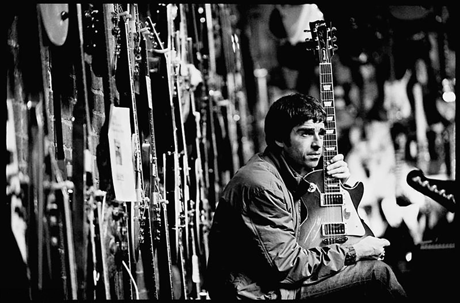 Oasis, Noel Gallagher at Music Ground guitar shop, Leeds, 2001 by Jill Furmanovsky
